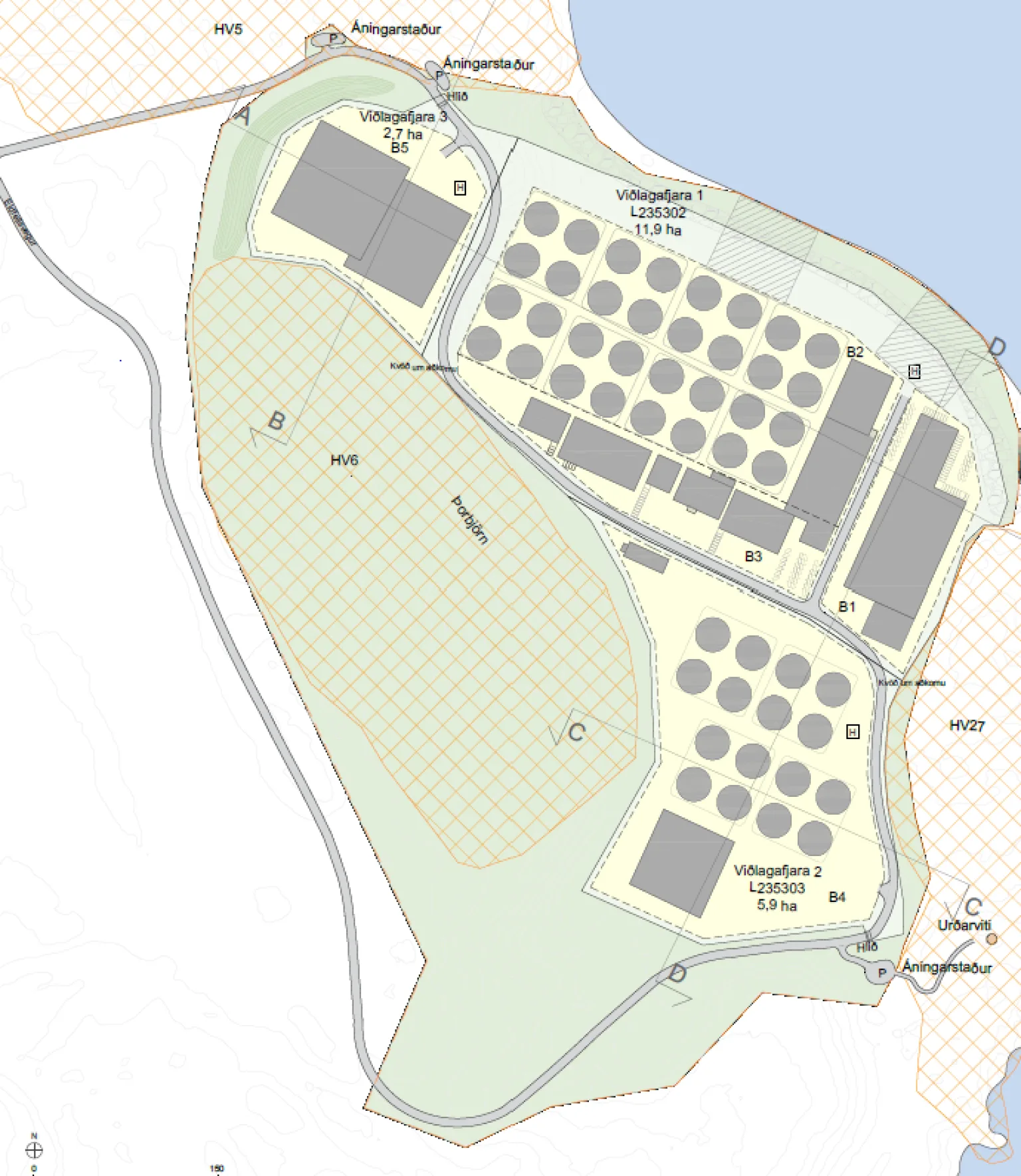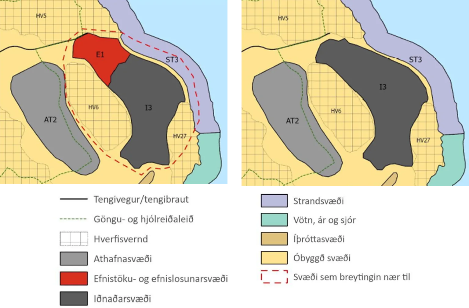 Gert er ráð fyrir að mörk milli lóða 1 og 2 í Viðlagafjöru breytist. Einnig er gert ráð fyrir að lóð nr. 1 stækki og að heildar gólfflötur mannvirkja aukist og verði að hámarki allt að 71.000 m2. Á lóð 2 var áður gert ráð fyrir geymslu jarðefna en þar er nú skilgreindur byggingarreitur með heildar gólffleti mannvirkja allt að 25.000 m2.
