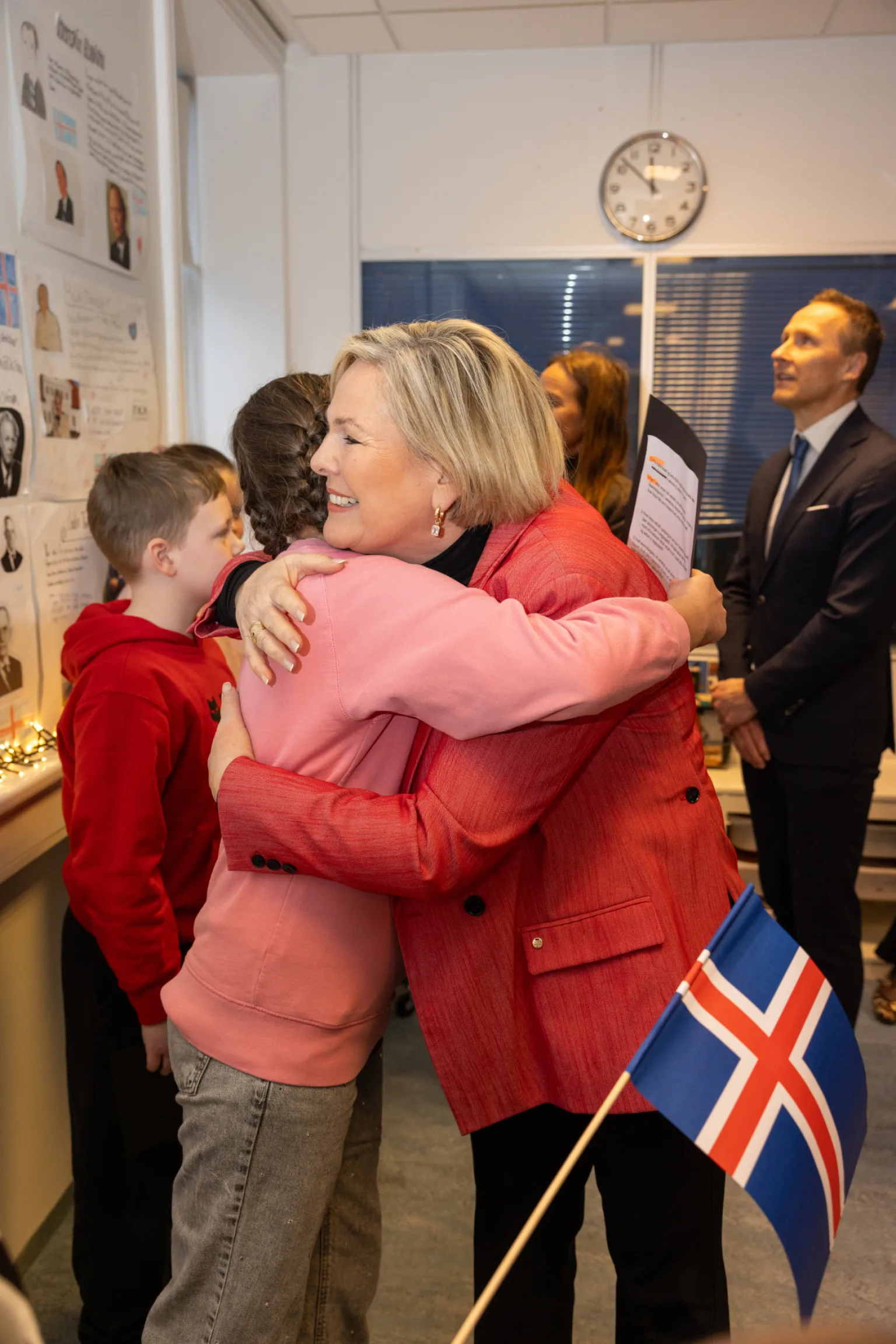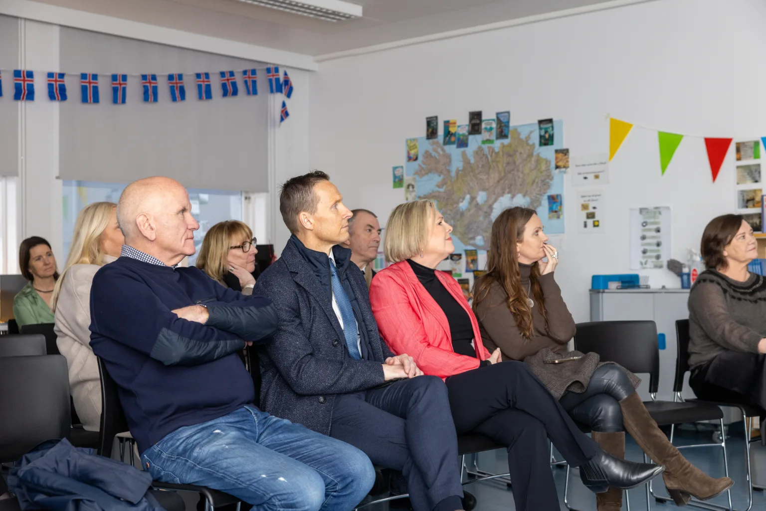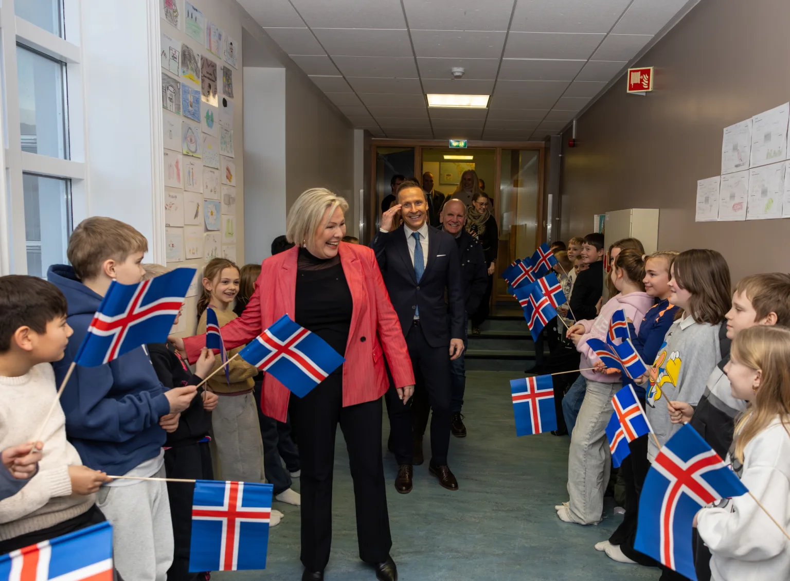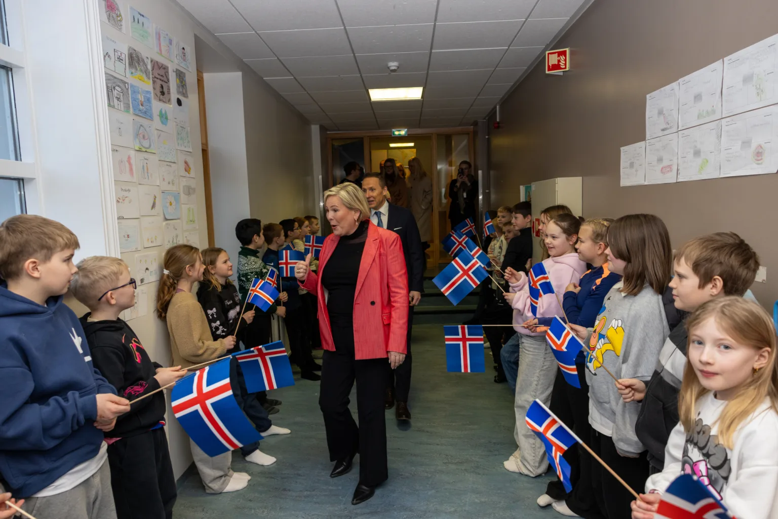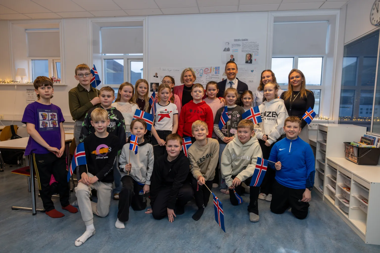 Laust fyrir hádegi lá leiðin í Grunnskóla Vestmannaeyja – Barnaskóla. Þar kynnti skólastjóri verðlaunaverkefnið „Kveikjum neistann“ og forsetahjón hittu nemendur í 5. bekk sem hafa unnið að verkefni um sögu forsetaembættisins.