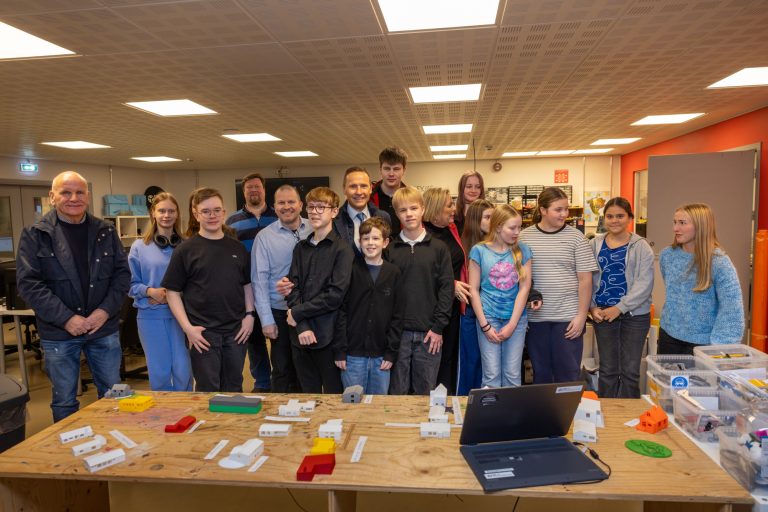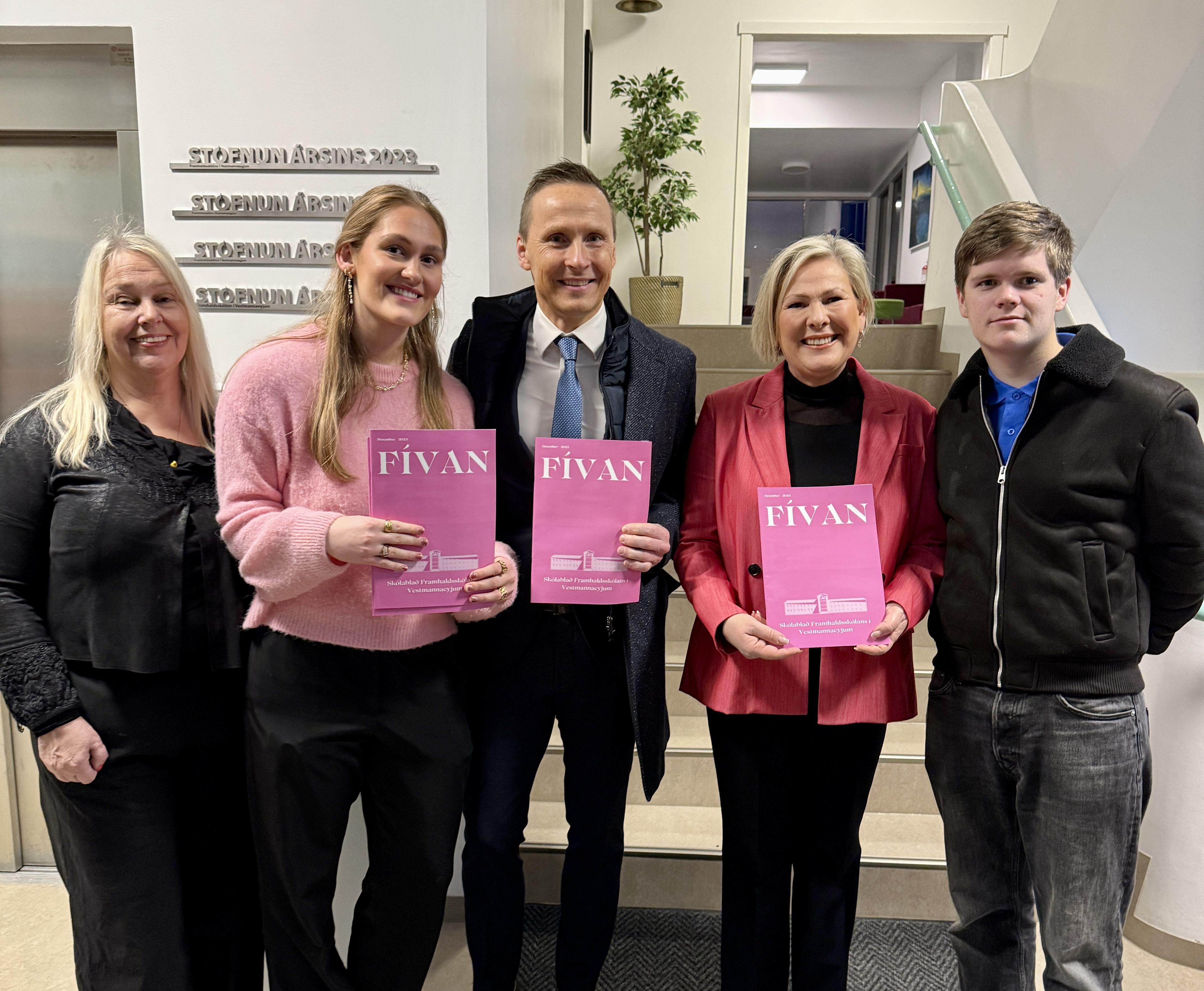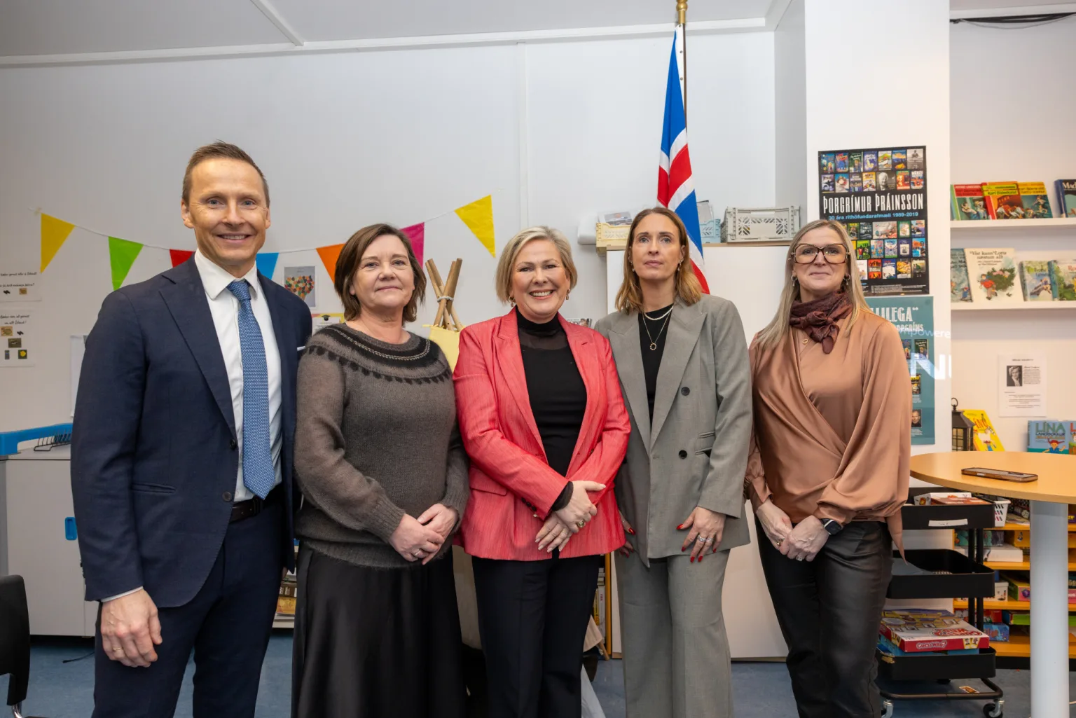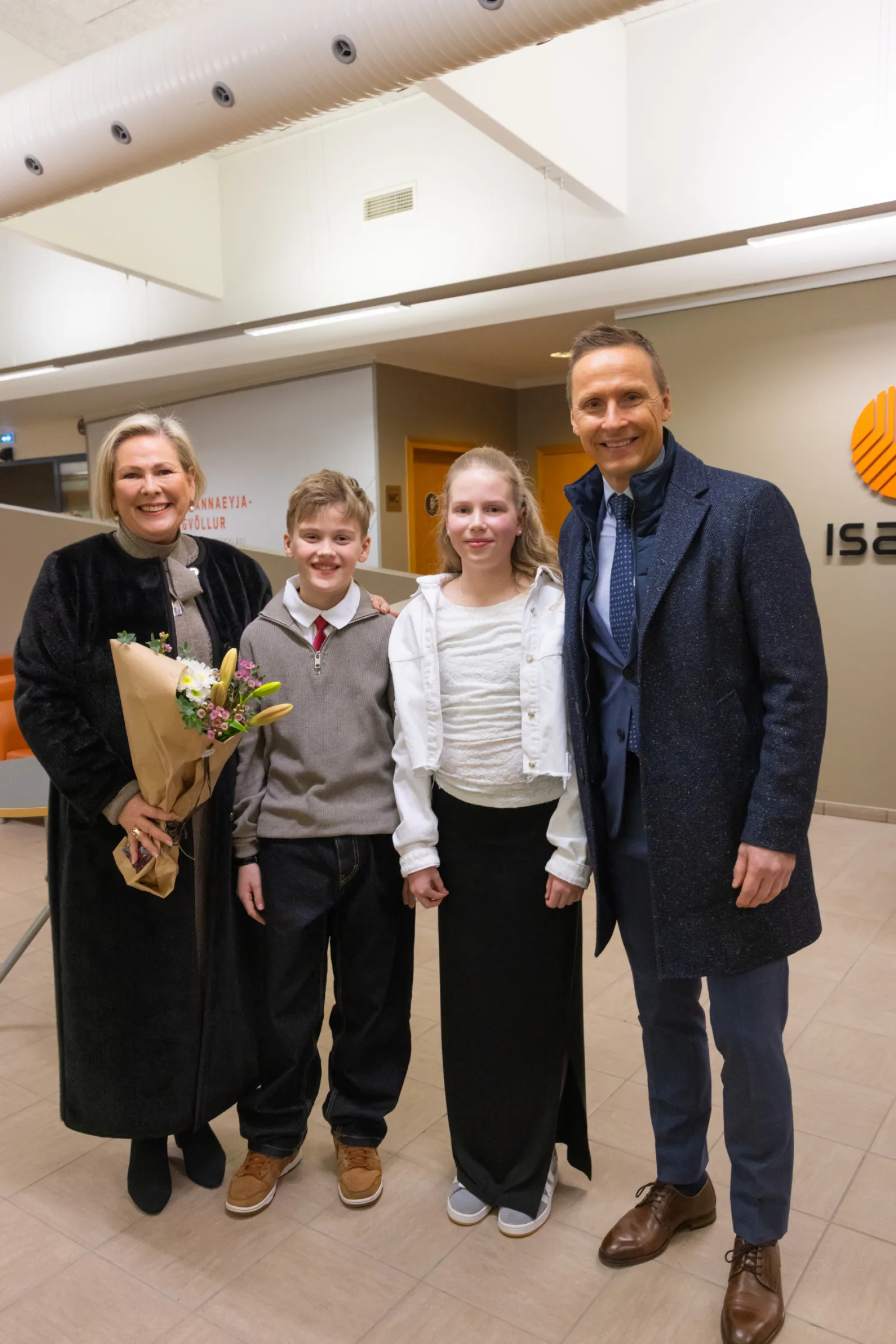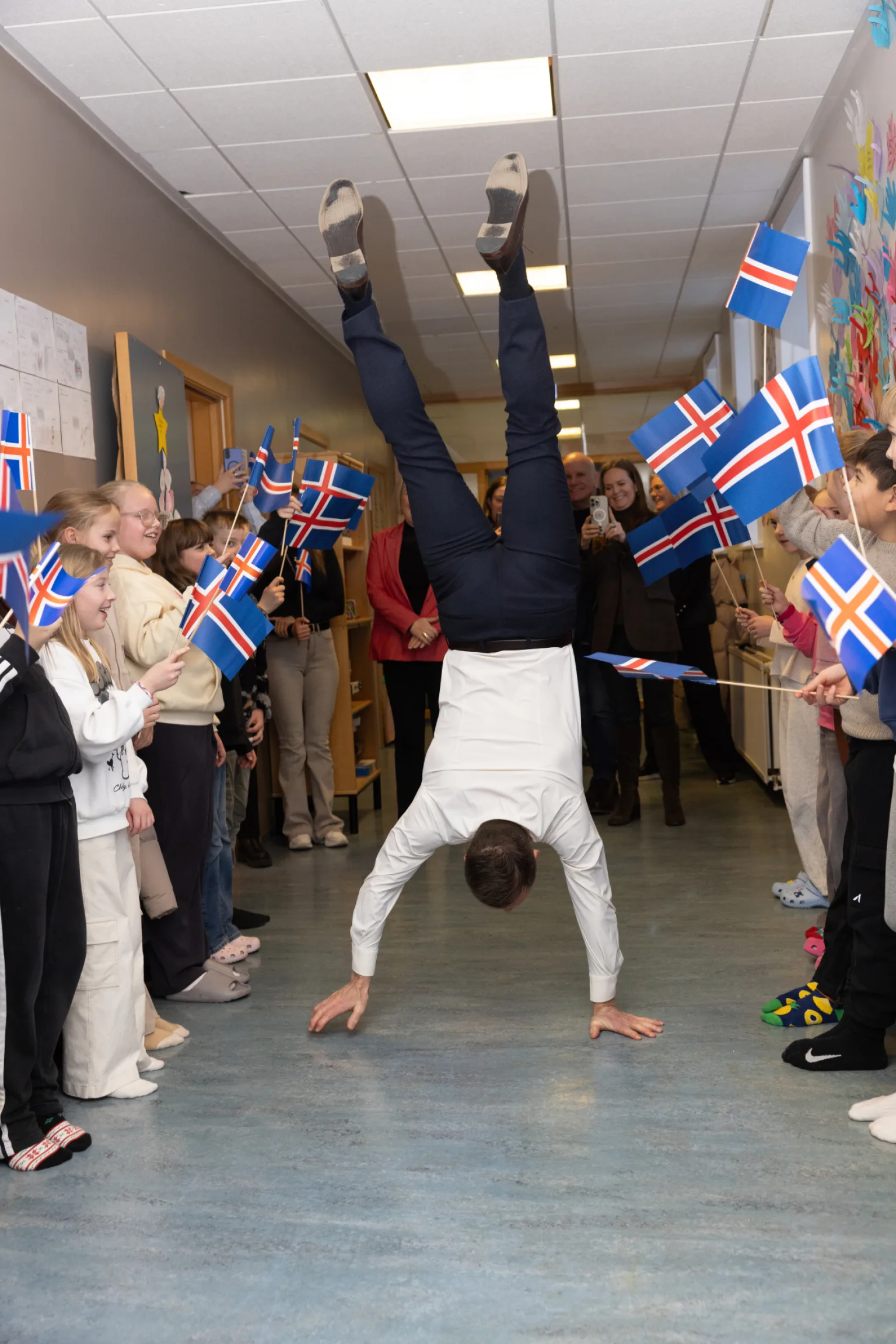 Laust fyrir hádegi lá leiðin í Grunnskóla Vestmannaeyja – Barnaskóla. Þar kynnti skólastjóri verðlaunaverkefnið „Kveikjum neistann“ og forsetahjón hittu nemendur í 5. bekk sem hafa unnið að verkefni um sögu forsetaembættisins.