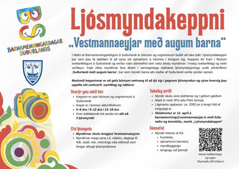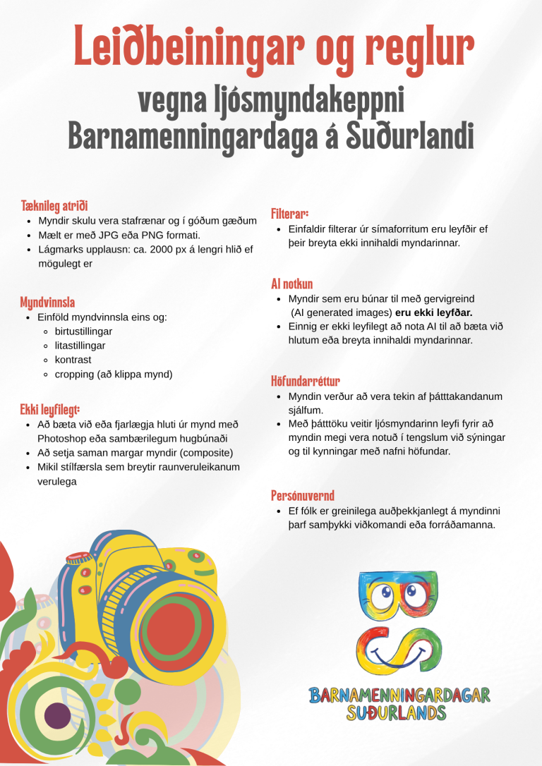 Í tilefni af Barnamenningardögum á Suðurlandi er börnum og ungmennum boðið að taka þátt í ljósmyndakeppni þar sem þau fá tækifæri til að sýna sitt sjónarhorn á heiminn í kringum sig. Keppnin fer fram í flestum sveitarfélögum á Suðurlandi og verður valin dómnefnd sem velur bestu myndirnar í hverju sveitarfélagi og veitir verðlaun. Þrjár efstu myndirnar fara áfram í sameiginlega stafræna ljósmyndasýningu undir yfirskriftinni „Suðurland með augum barna“, þar sem myndir barna alls staðar af Suðurlandi verða sýndar saman.