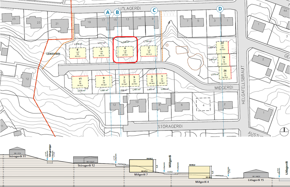 Við Miðgerði 4 er gert ráð fyrir einbýli, ein hæð eða ein hæð og kjallari. Hámarksbyggingarmagn sé húsið ein hæð er 180 m2 en sé um að ræða eina hæð og kjallara er hámarksbyggingarmagn 280 m2.