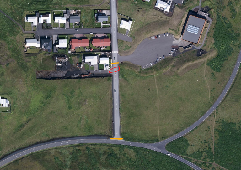 Framkvæmdasvæði er rauðmerkt og appelsínugulur skilgreinir lokun.