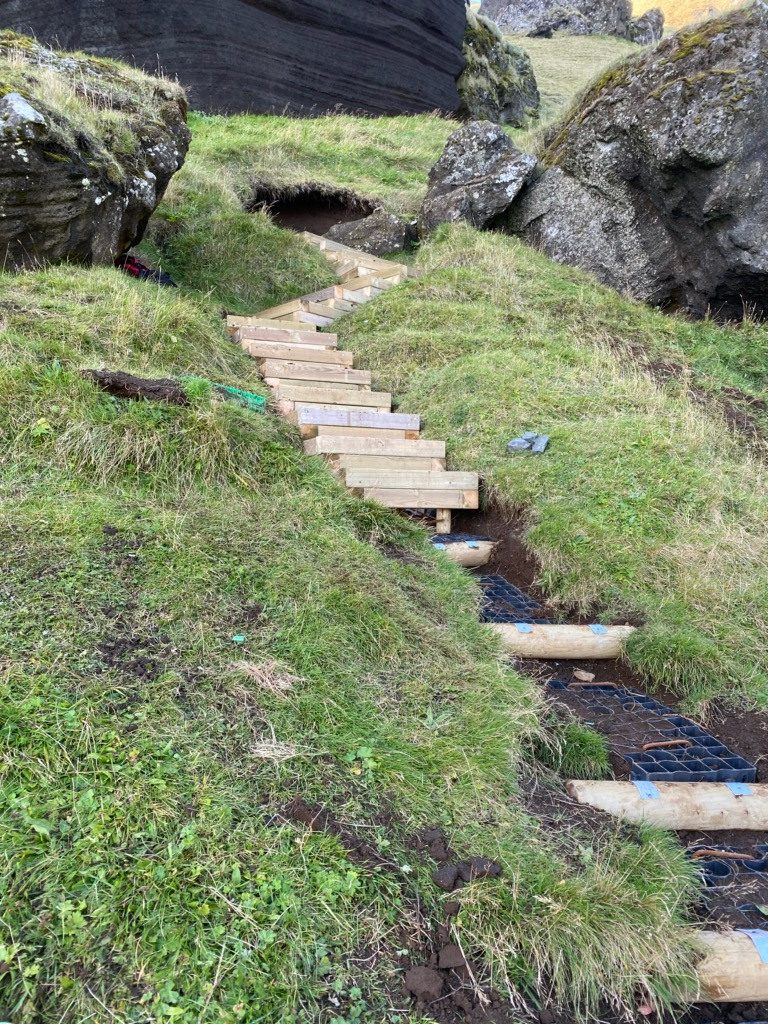 Vinna við lagfæringu á gönguleiðinni á Dalfjall stendur nú yfir. Verkefnið er styrkt af Framkvæmdasjóði ferðamannastaða en framkvæmdir eru í höndum Vestmannaeyjabæjar og sjálfboðaliða.