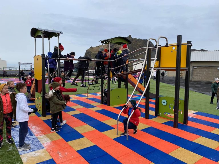 Það var mikil gleði hjá nemendum Hamarsskóla í dag þegar ný leiktæki voru tekinn til notkunar á skólalóðinni