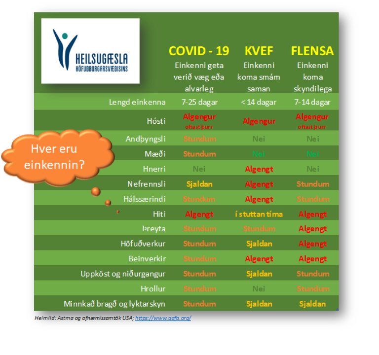 Heilsugæslan hefur tekið saman töflu sem tekur mismunandi einkenni COVID-19, kvefs og flensu.