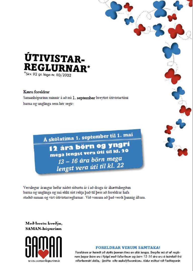 SAMAN hópurinn vill vekja athygli foreldra á að útivistartími barna og unglinga breyttist 1. september s.l.Munið að góður svefn skiptir sköpum.
