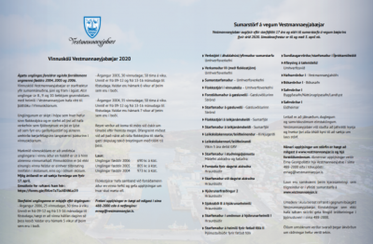 Öll sumarstörf í stofnunum Vestmannaeyjabæjar eru nú laus til umsóknar. Umsóknarfrestur er til og með 3. apríl 2020.