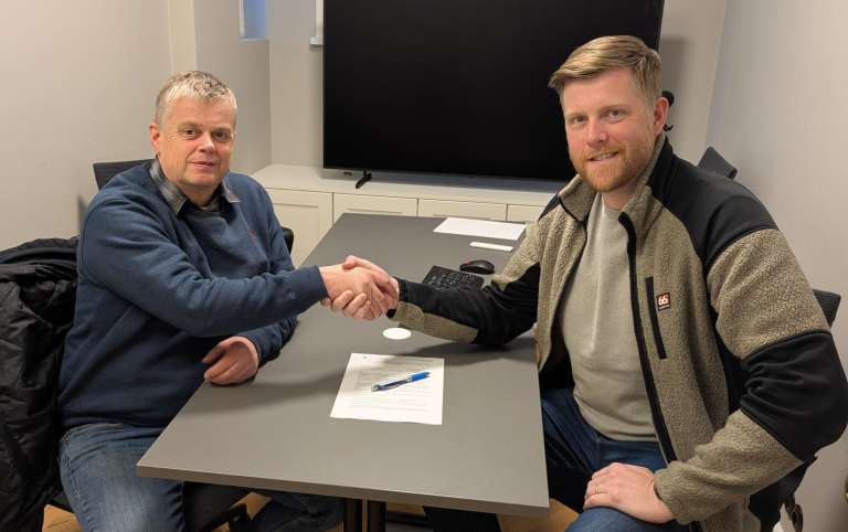 Brynjar Ólafsson framkvæmdastjóri umhverfis- og framkvæmdasviðs og Ólafur Einarsson hjá Þjótanda skrifuðu undir verksamning vegna jarðvinnu og lagna á Hásteinsvelli