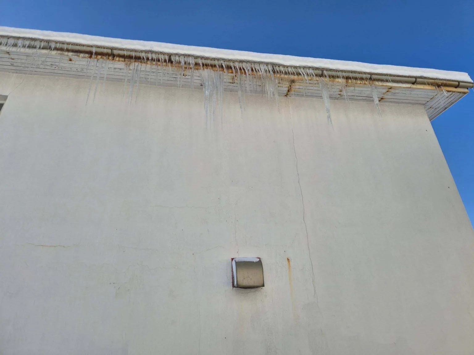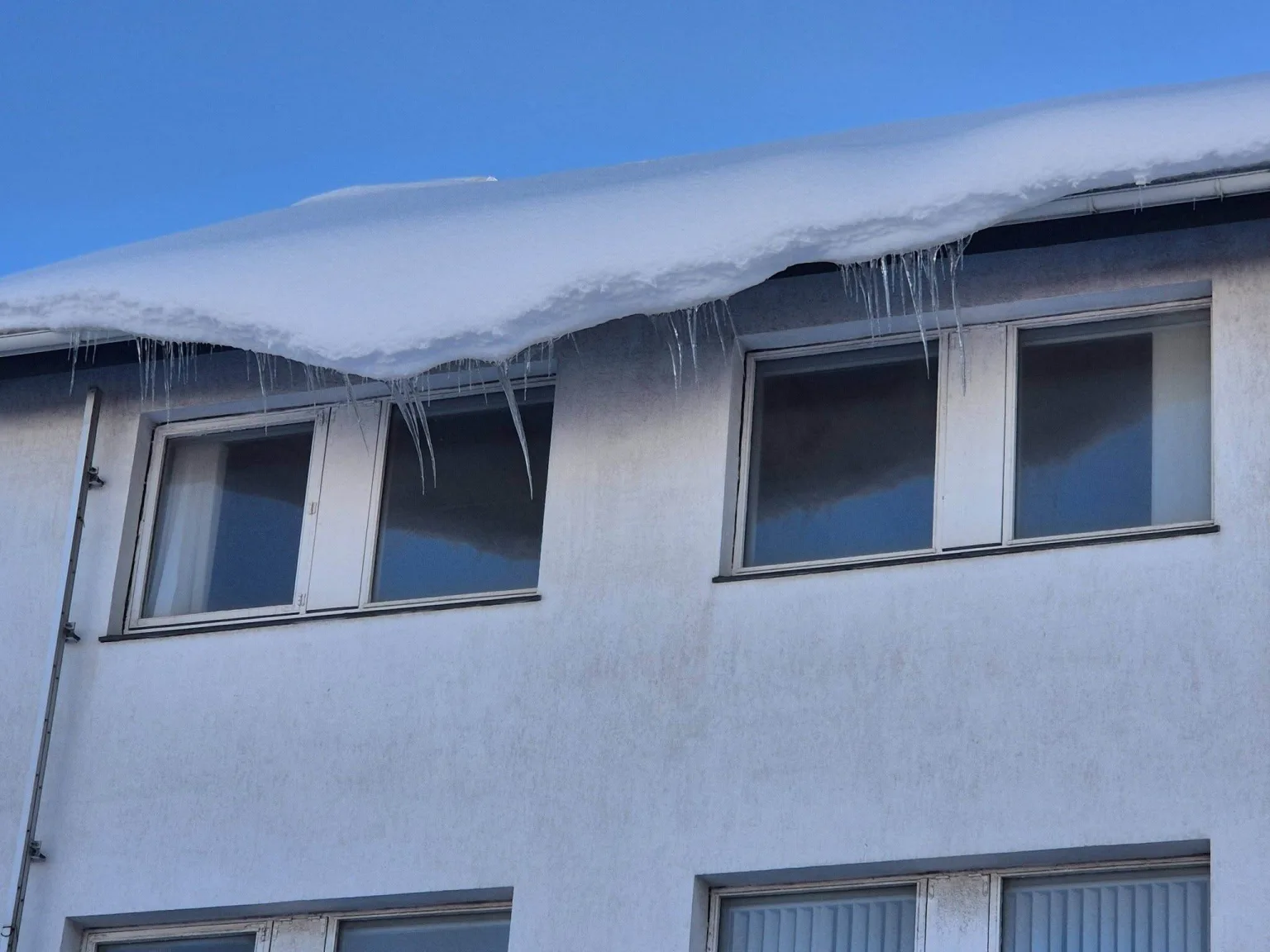Mjög víða í bænum eru stærðarinnar snjóhengjur og grýlukerti farin að hanga fram af þakköntum með tilheyrandi slysahættu fyrir gangandi vegfarendur.