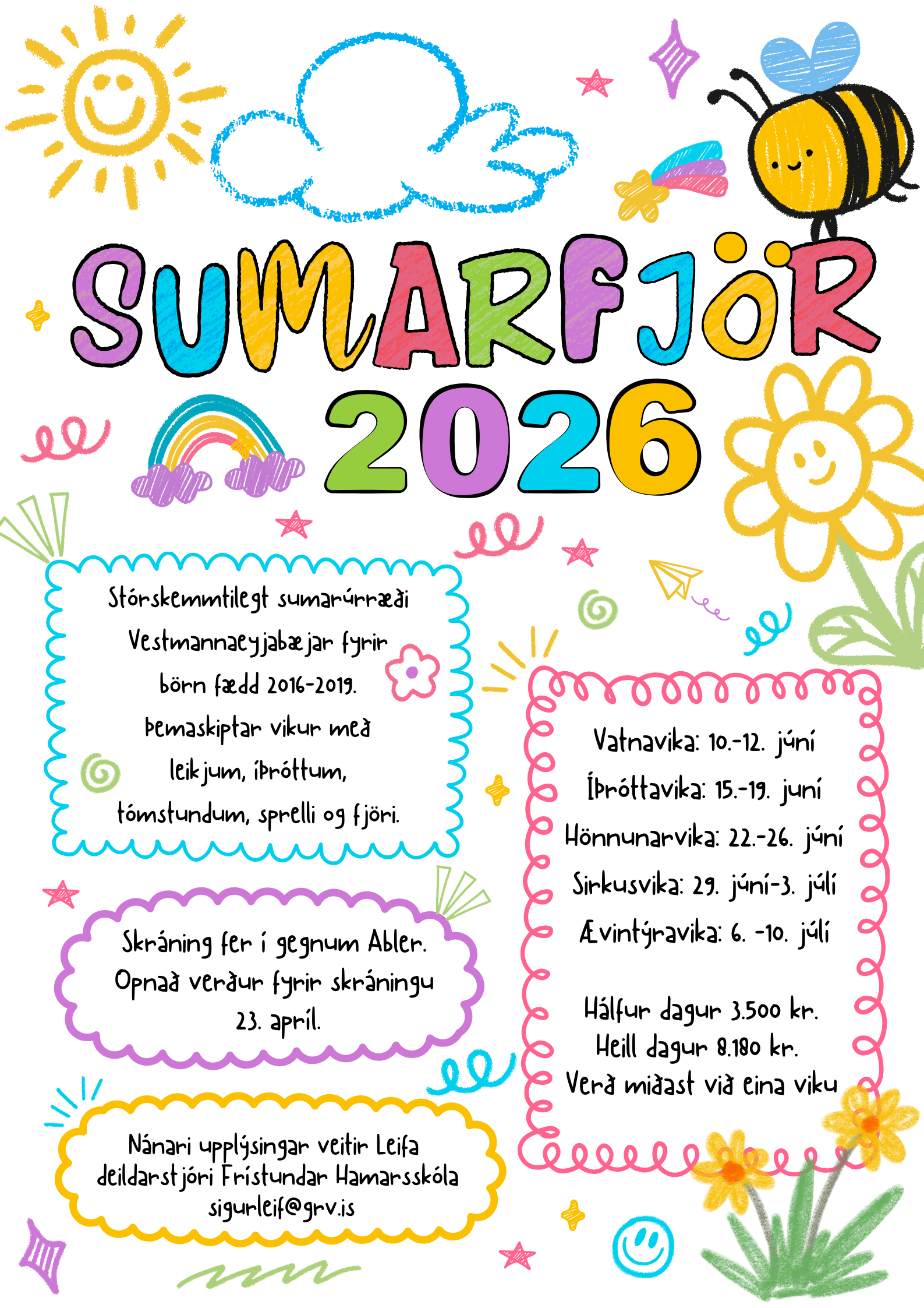 Skráning í Sumarfjörið hefst á Sumardaginn fyrsta þann 23. apríl og fer hún fram í gegnum Abler. Síðasti dagur til að skrá barn er kl. 12 að hádegi föstudags í vikunni áður.