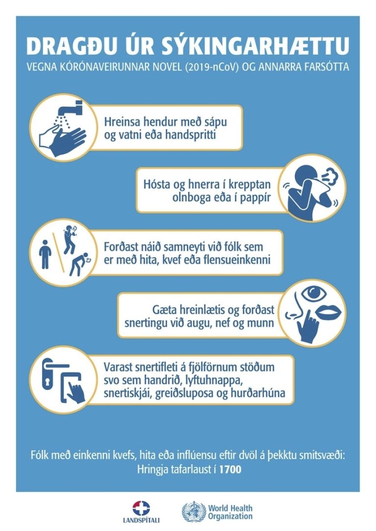 Við munum gera það sem í okkar valdi stendur til að koma í veg fyrir að Kórónaveiran Novel (2019-nCoV) og aðrar smitsóttir berist til okkar því við erum með viðkvæman hóp einstaklinga. Við viljum líka fylgja ráðleggingum almannavarna að draga úr öllum handaböndum og kossaflensi. Eins viljum við biðja þá einstaklinga sem dvalið hafa erlendis á þeim svæðum sem kórónaveiran hefur komið upp að forðast heimsóknir á Hraunbúðir þar til gengið hefur verið úr skugga um að þeir beri ekki með sér smit. Annars bendum við öllum á að fylgjast með og kynna sér leiðbeiningar til almennings inn á www.landlaeknir.is