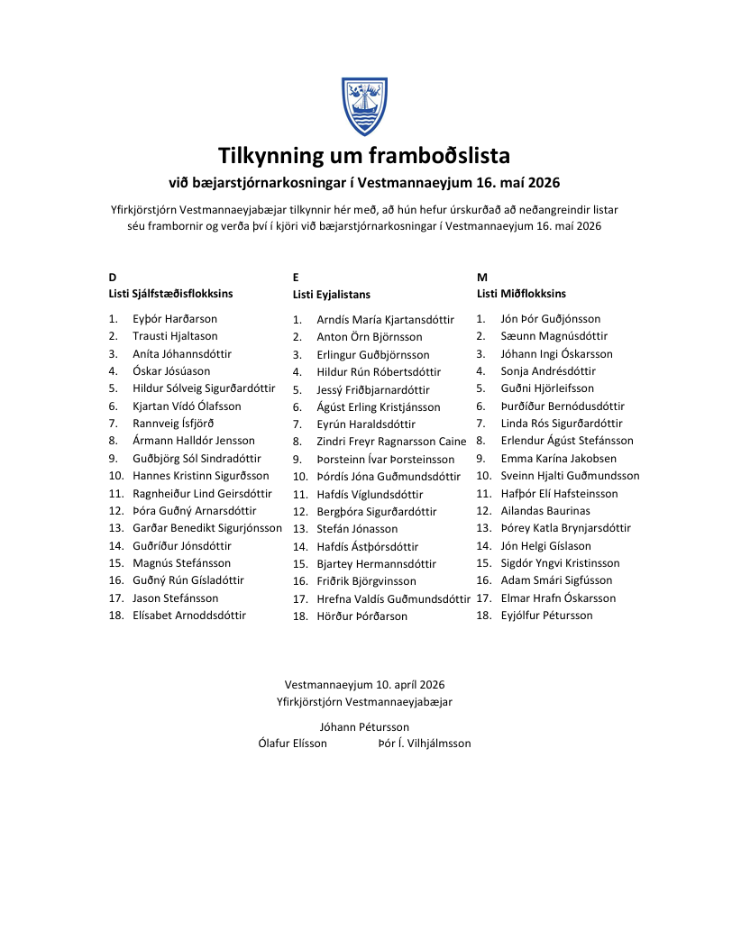 við bæjarstjórnarkosningar í Vestmannaeyjum 16. maí 2026