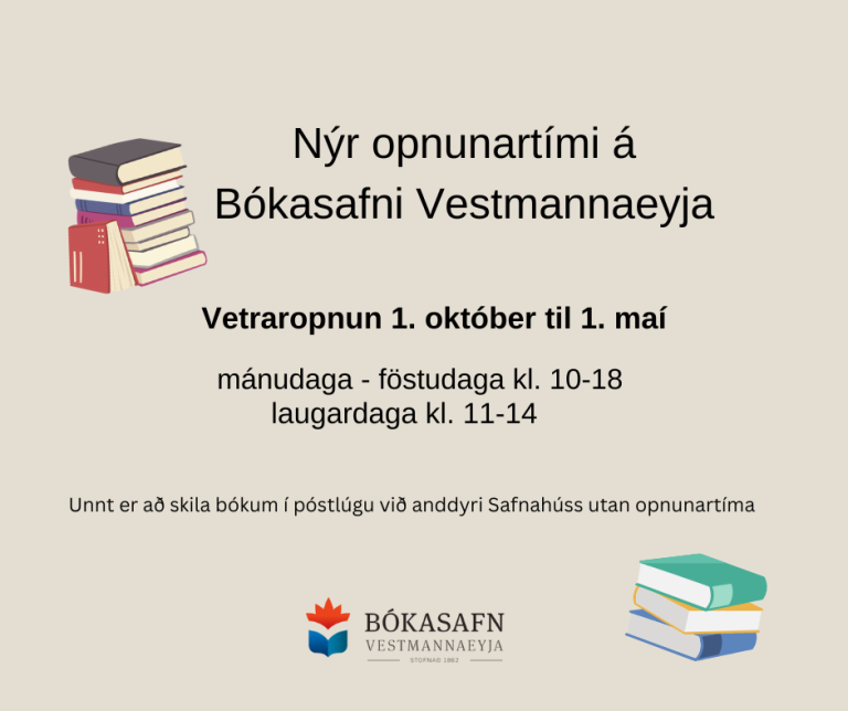 In recent years, there has been a discussion about extending the opening hours of the library to satisfy as many people as possible and to improve services for residents. The primary school in Vestmannaeyjar (GRV) is working on the development project "Ignite the spark!" (Kveikjum neistann!) And the library supports this project with color coding on the children's section and now extended opening hours.