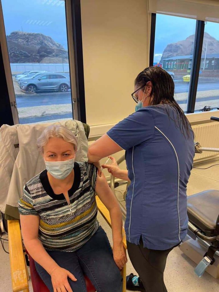 Fyrst til að þiggja sprautu var hún Dóra Kolbeinsdóttir starfsmaður í aðhlynningu. Hún var full tilhlökkunar yfir tilefninu. Á eftir fékk hún kokteil og gat loks látið sig dreyma um sól og hvíta sanda. Fleiri starfsmenn fylgdu í kjölfarið og fleiri eru eftir síðar í vikunni.