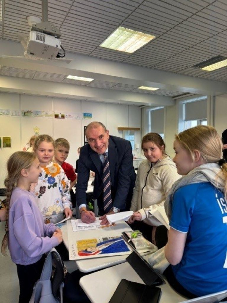Fyrst lá leiðin í grunnskólann og í framhaldi á Kirkjugerði og Sóla þar sem forsetinn skoðaði skólana og heilsaði upp á nemendur og starfsfólk. Nemendur í 5. bekk sýndu honum verkefni sem þeir voru að vinna um alla forseta lýðveldisins og þá tók hann þátt í stærðfræðileik með 10. bekk. Nemendur á Kópvík í Kirkjugerði sungu fyrir forsetann lag um vináttu og þá var honum boðin þátttaka í söngfundi á Sóla.