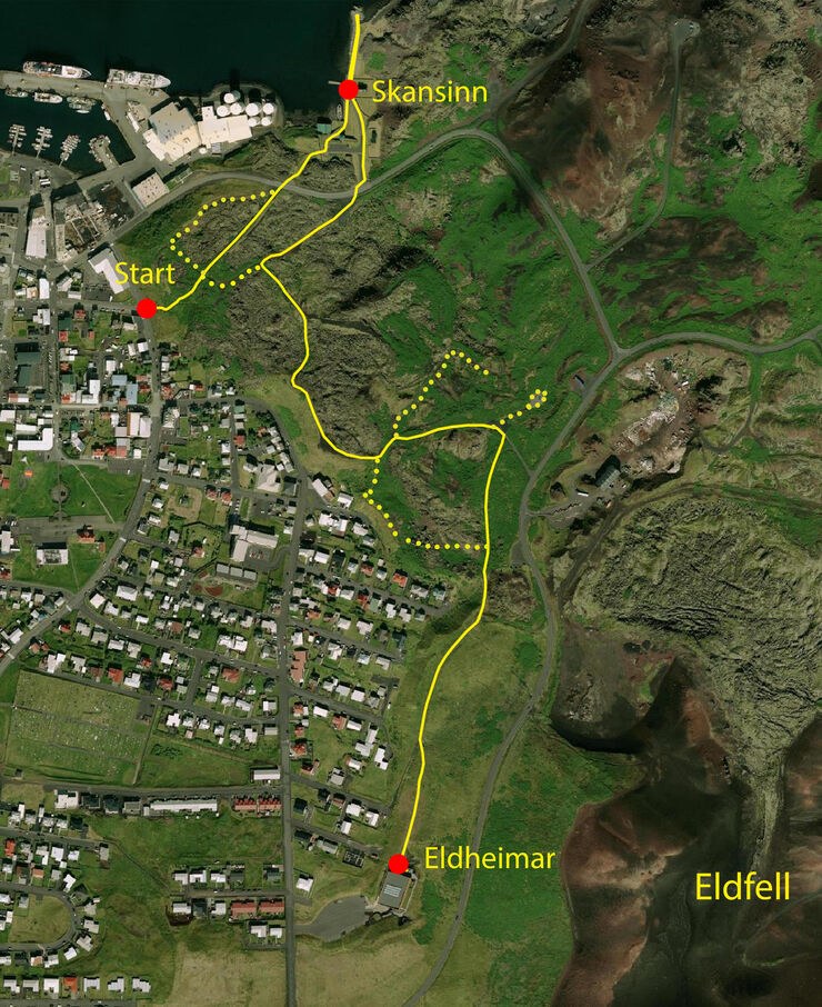 Gönguleiðin hefst við stigann við gatnamót Kirkjuvegar og Miðstrætis. Þaðan liggur leiðin eftir merktum göngustíg í hrauninu sem liggur niður á Skans. Af Skansinum er gengið eftir öðrum stíg í hrauninu í átt að Eldheimum þar sem leiðin endar, en hægt er að fylgja vegvísum þangað. Hægt er að fara margar leiðir um nýja hraunið en mikilvægt er að halda sig innan stíga til að forðast átroðning.