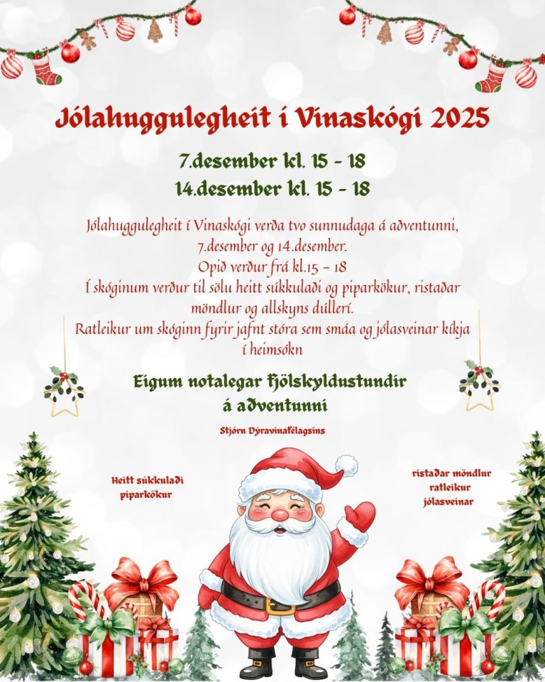 Dýravinafélag Vestmannaeyja stendur fyrir jólastund í skóginum við dýraspítalann við Löngulá. Hægt er að rölta um skóginn, kaupa sér heitt súkkulaði, ristaðar möndlur, jólaskraut og fleira. Grinch ætlar að mæta á svæðið, jólatónlist mun óma í skóginum og það ættu allir að geta notið þess að eiga stund saman.