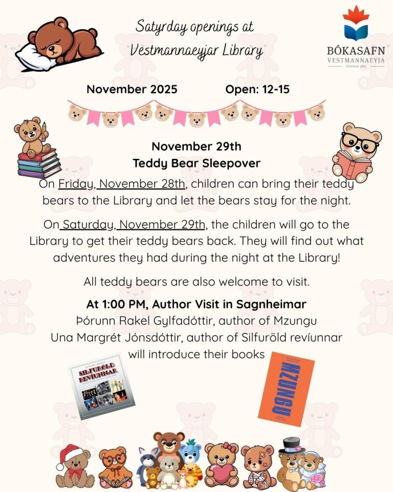 On Friday, November 28th, children can bring their teddy bears to the Library and let the bears stay for the night. On Saturday, November 29th, the children will go to the Library to get their teddy bears back. They will find out what adventures they had during the night at the Library! At 1:00 PM, Author Visit in Sagnheimar Þórunn Rakel Gylfadóttir, author of Mzungu Una Margrét Jónsdóttir, author of Silfuröld revíunnar will introduce their books