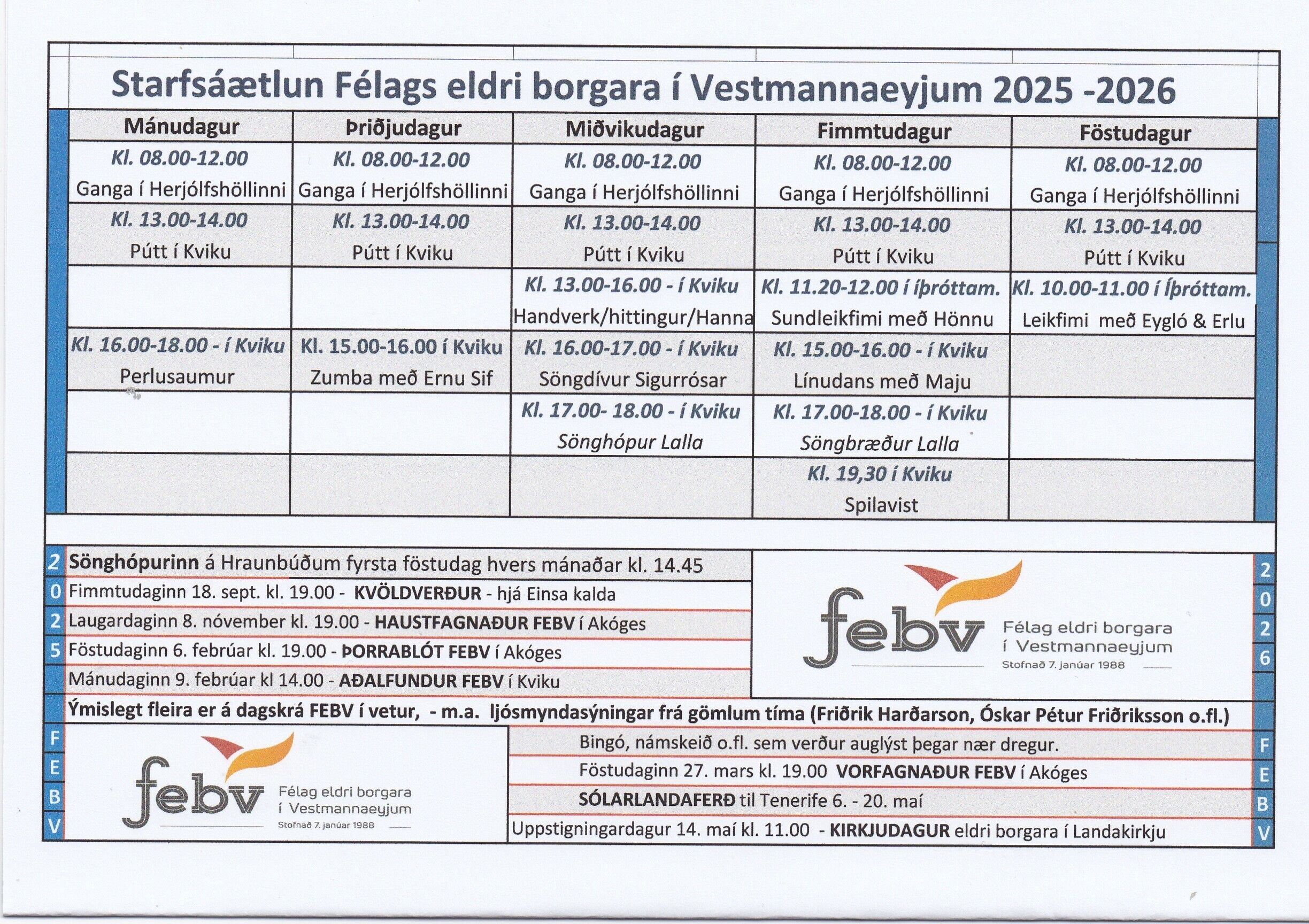 Sjá má nánari upplýsingar fyrir meðlimi á facebook síðu félagsins hér Félag eldri borgara í Vestmannaeyjum